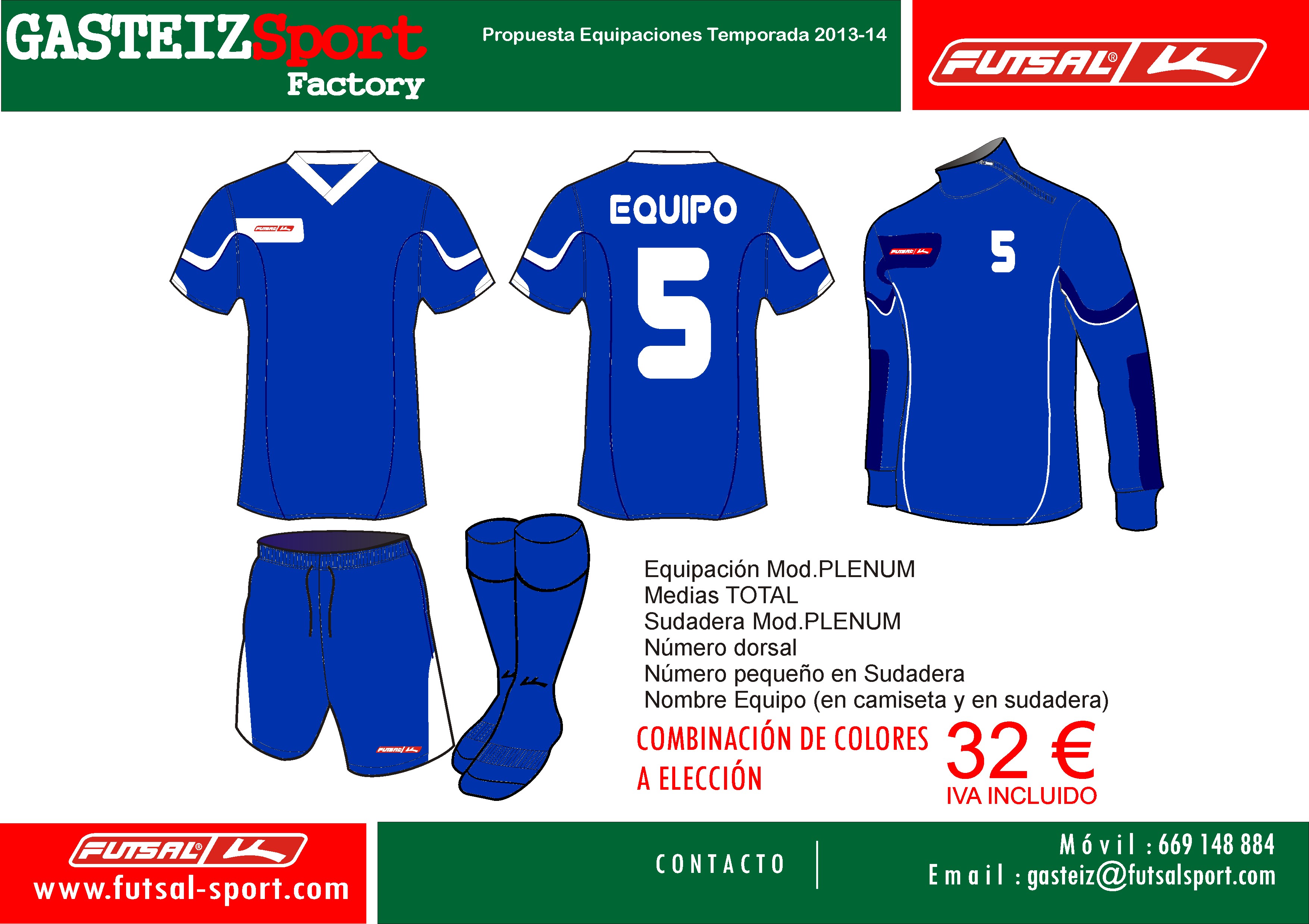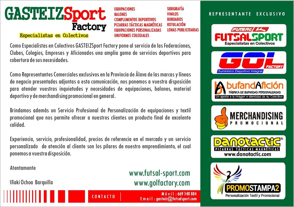 Todos aquellos que estéis interesados en contactar sin compromiso con el comercial de FUTSAL para Araba, Iñaki Ochoa, podéis hacerlo a través del teléfono 669 148 884 o por medio del correo electrónico gasteiz@futsalsport.com , identificandoos como club perteneciente a nuestra entidad.