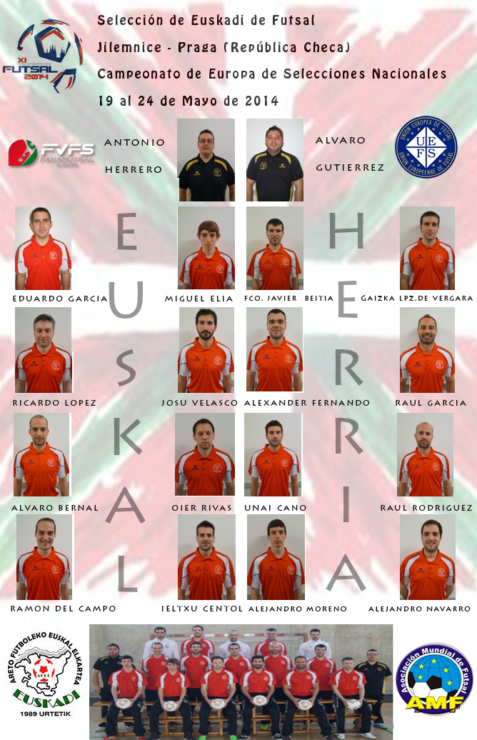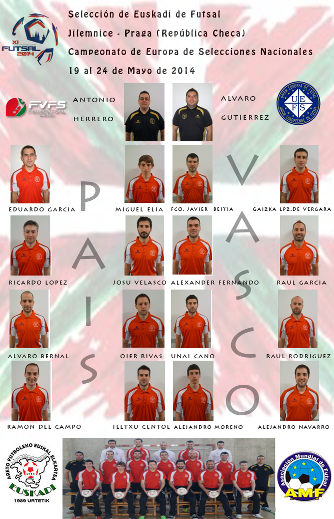 Desde FAVAFUTSAL, a continuación os ofrecemos el montaje fotográfico de los jugadores que integran la selección de Euskadi de Futsal, de los cuales doce acudirán representando a la tricolor en el XI Campeonato de Europa de Selecciones Nacionales de Futsal, que se disputará en las sedes de Jilemnice y Praga ( República Checa ), entre los días 19 al 24 de mayo de 2014.