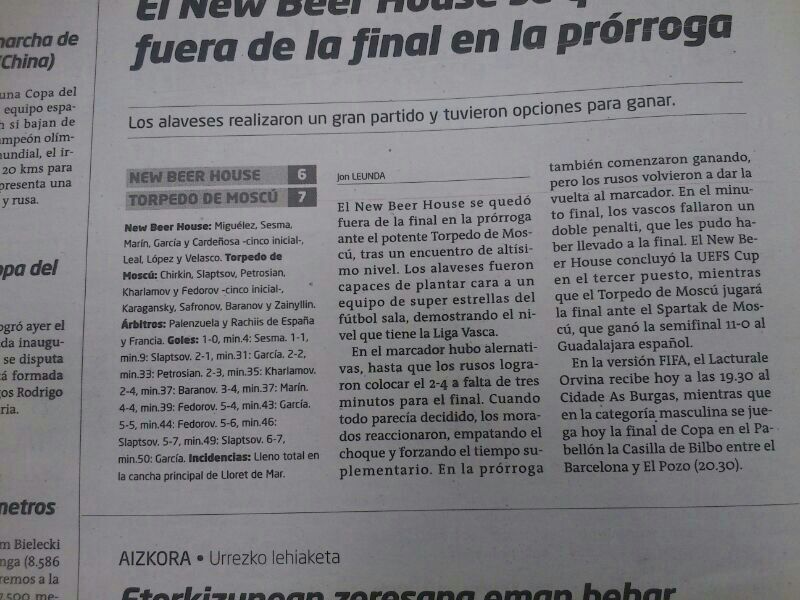 Desde FAVAFUTSAL, os comunicamos que el New Beer House ha caído eliminado en la prórroga por 6 goles a 7, tras realizar un gran partido ante el Torpedo de Moscú.